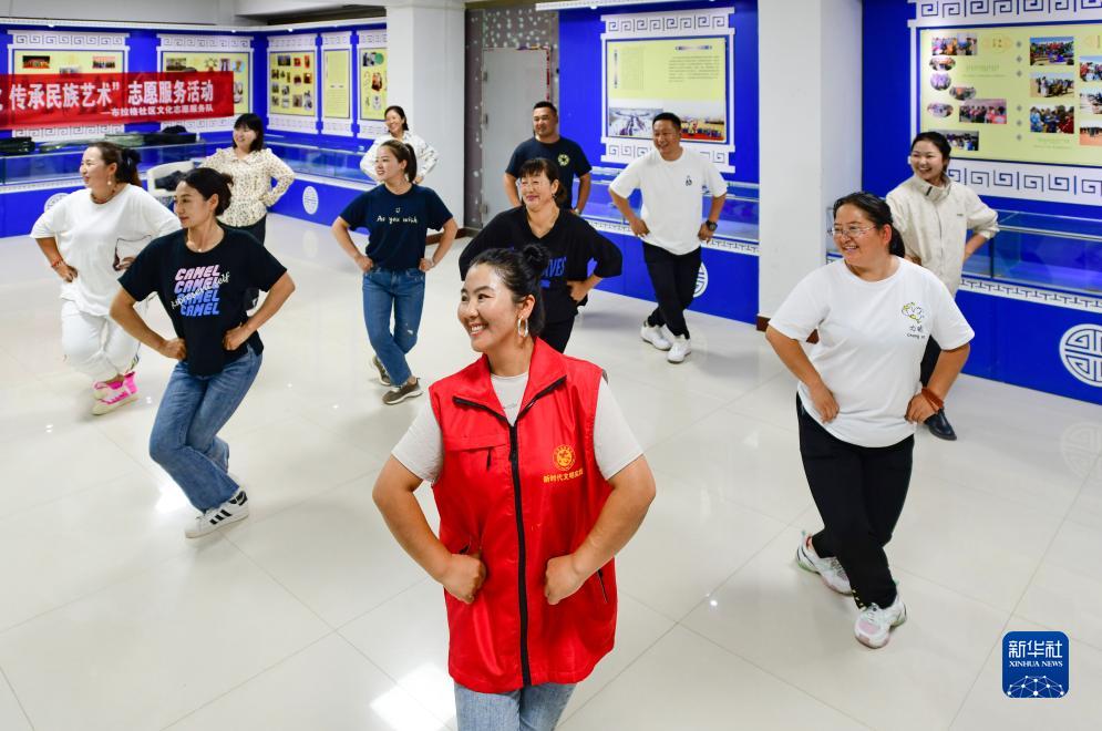 8月26日,在鄂托克前旗上海廟鎮阿勒&嘎查文化活動中心美育課堂上,志願者奇明(前)帶領農牧民練習舞蹈。