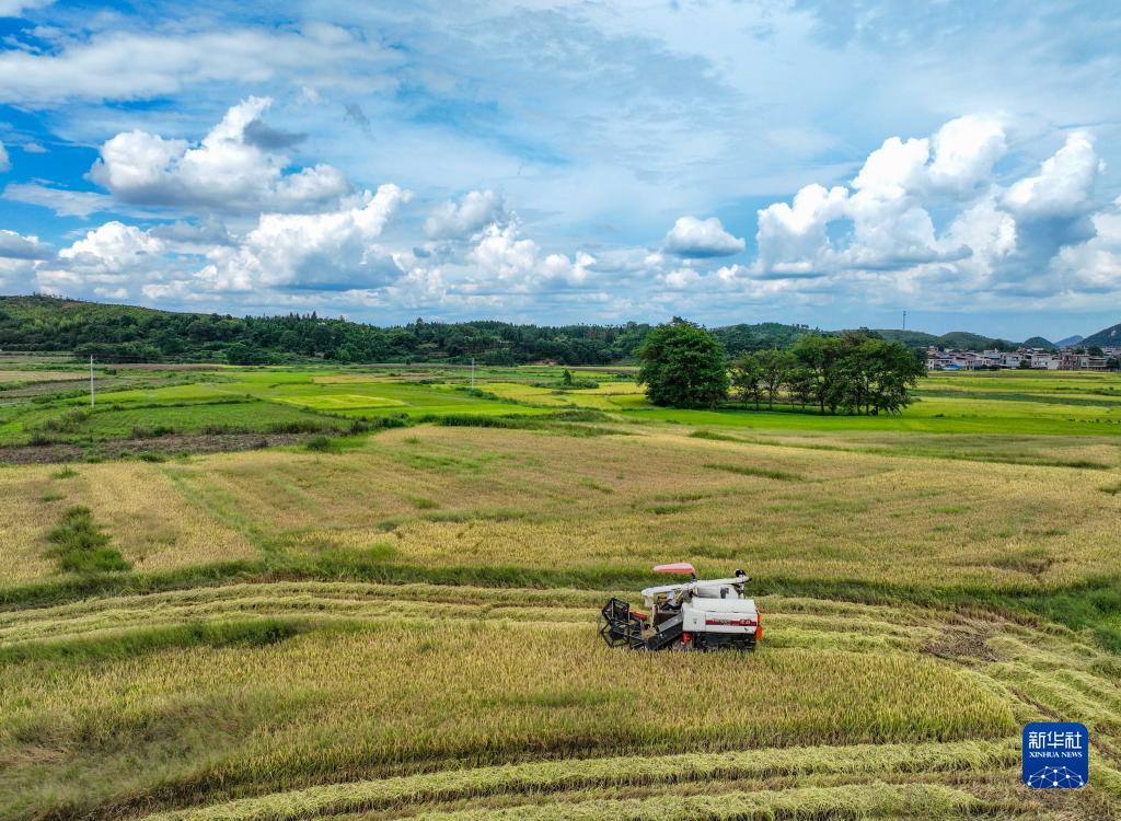 8月25日,在湖南省永州市道縣清塘鎮小坪村,農民駕駛機械收割水稻(無人機照片)。