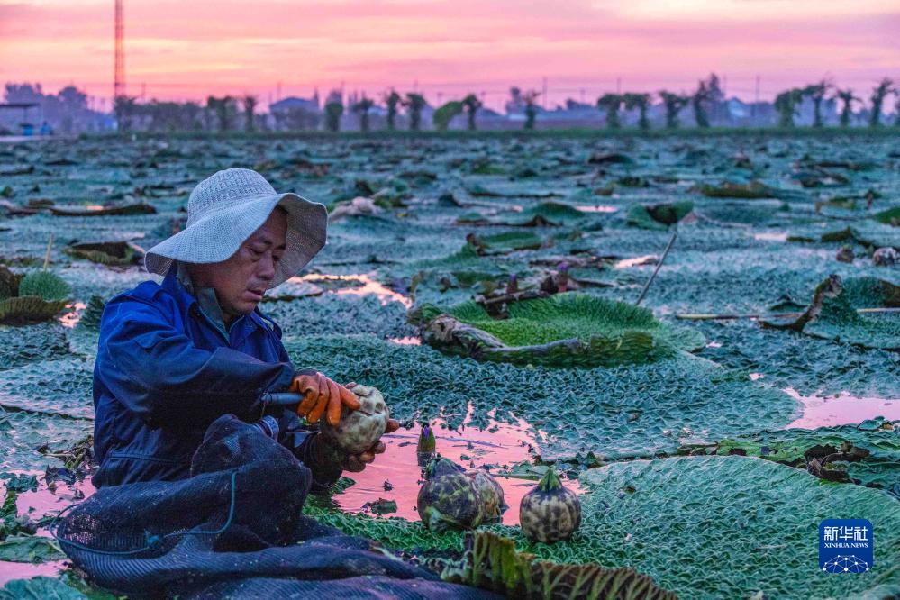 8月26日,江蘇省泰州市姜堰區顧高鎮申俞村農民在采收芡實。