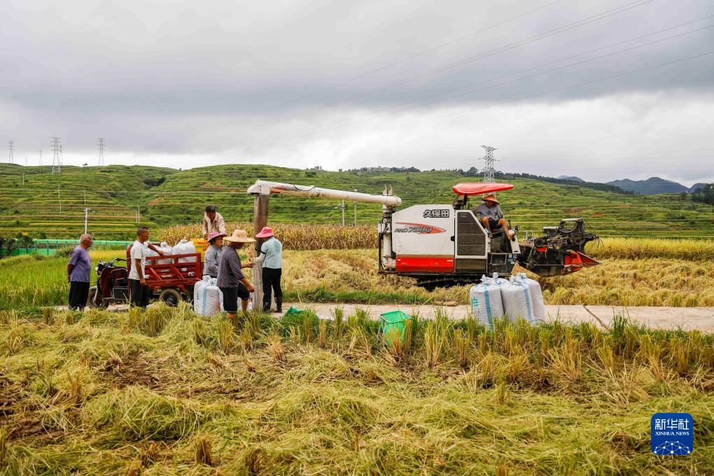 8月26日,村民在貴州省黔南布依族苗族自治州羅甸縣沫陽鎮紅星村裝運稻穀。