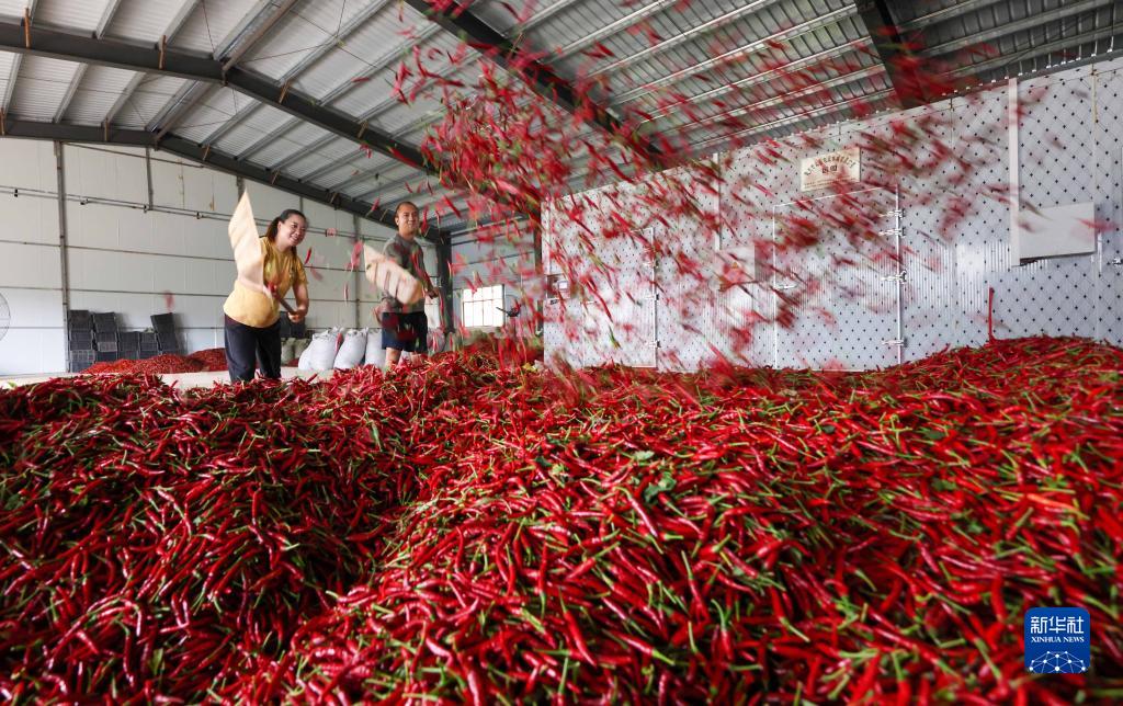 8月26日,貴州省黔東南苗族侗族自治州岑鞏縣水尾鎮大樹林村村民在整理剛采收的辣椒。
