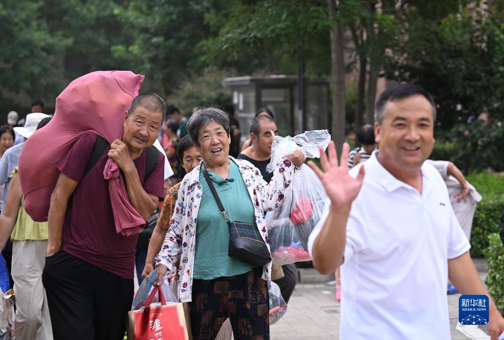 8月20日,在天津市西青區赤龍南街道一臨時安置點,村民收拾行李準備回家。