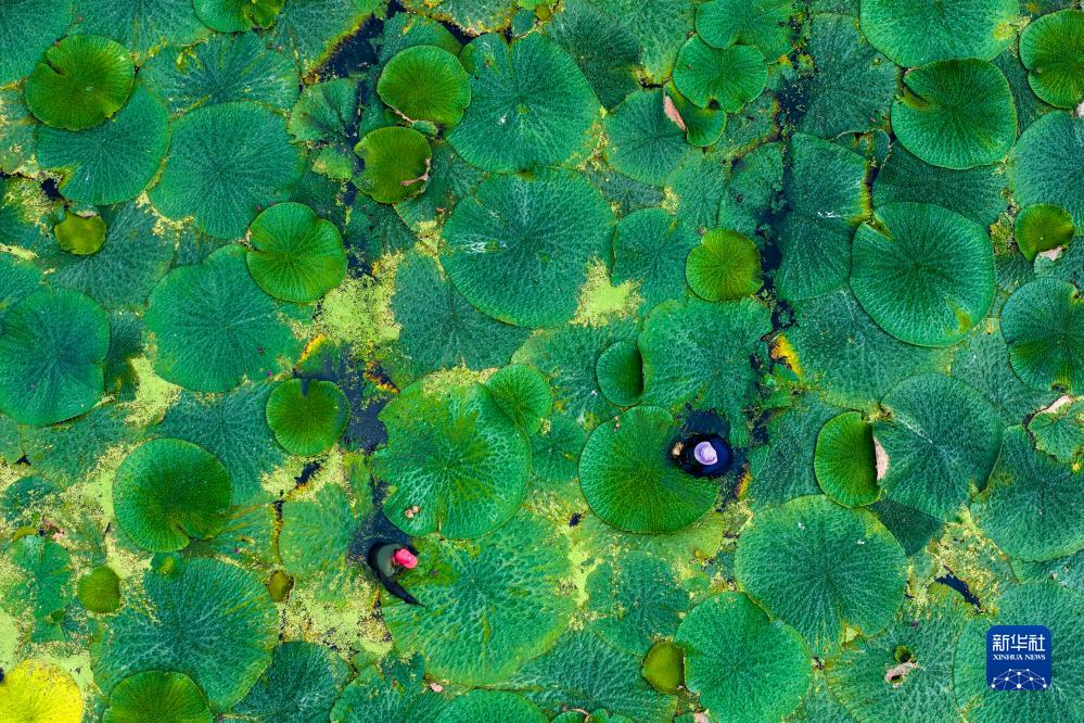 8月21日,江蘇省泰州市姜堰區顧高鎮申俞村農民在采收芡實(無人機照片)。
