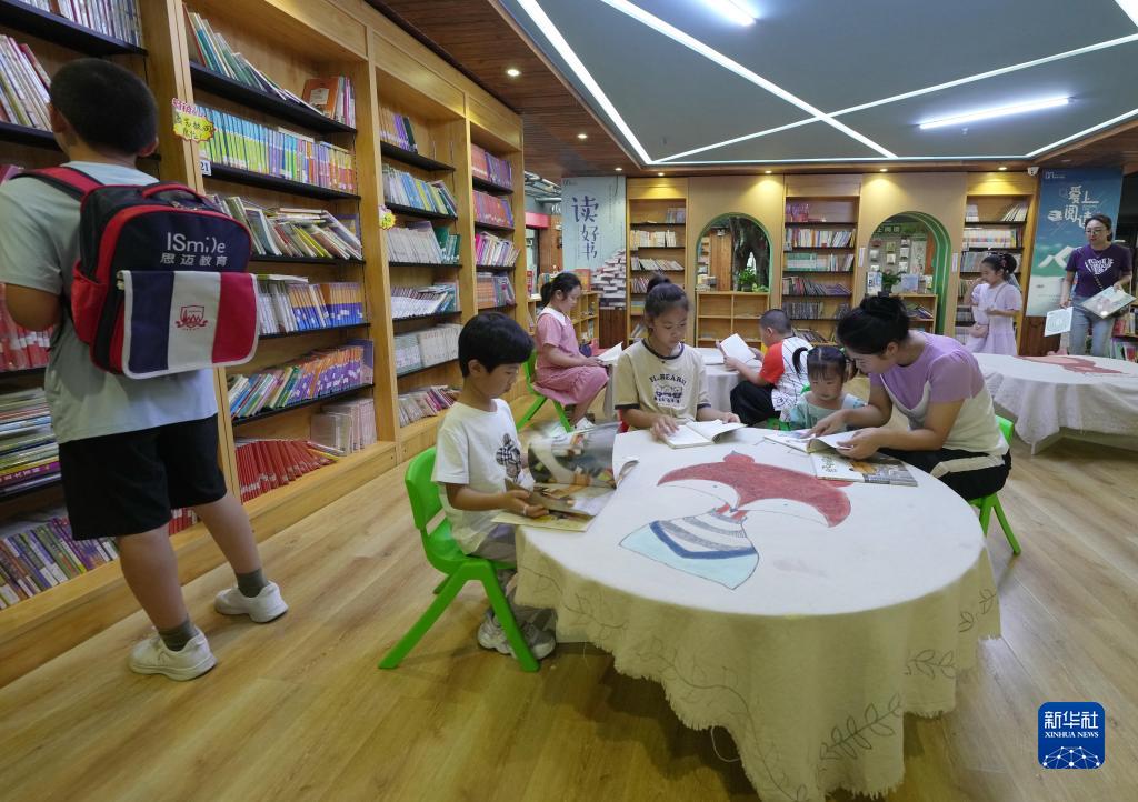8月26日,家長帶着孩子在秦皇島市海港區青年書店閱讀區閱讀。