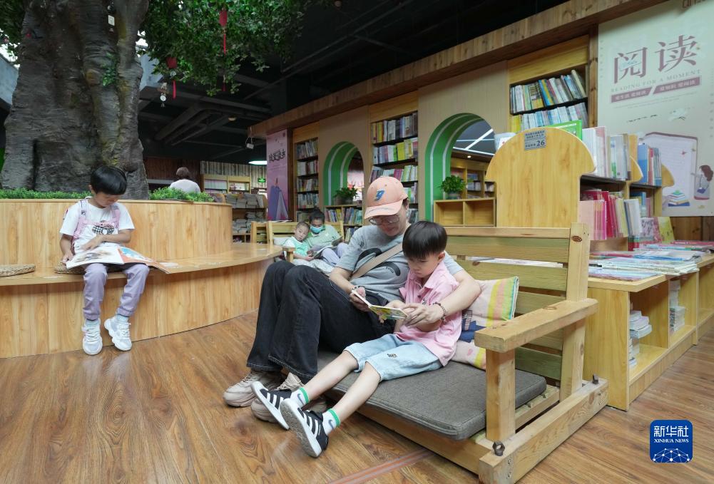 8月26日,家長帶着孩子在秦皇島市海港區青年書店閱讀區閱讀。