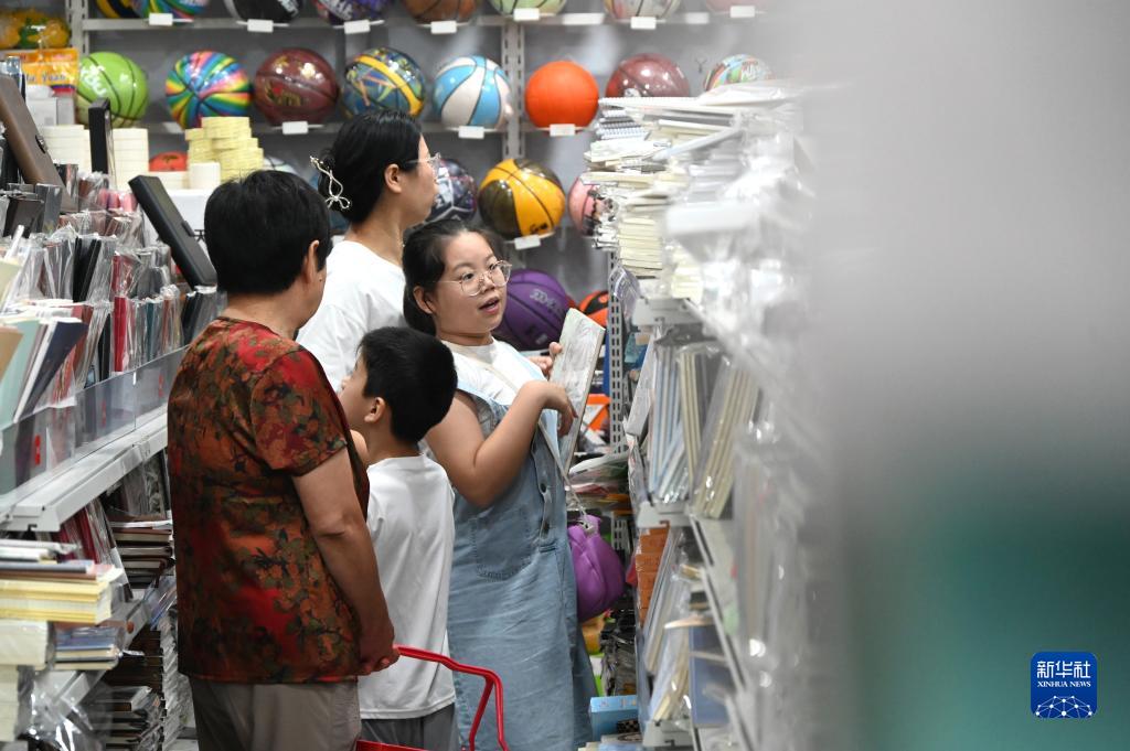 8月26日,在河南省開封市一家文具店內,學生和家長在挑選文具。