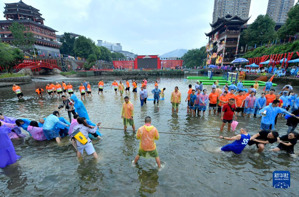 當日,在湖北省恩施土家族苗族自治州宣恩縣仙山貢水旅游區的貢水河中,近千名居民和游客組成60余支拔河隊在河中開展趣味拔河比賽,感受快樂與清涼。
