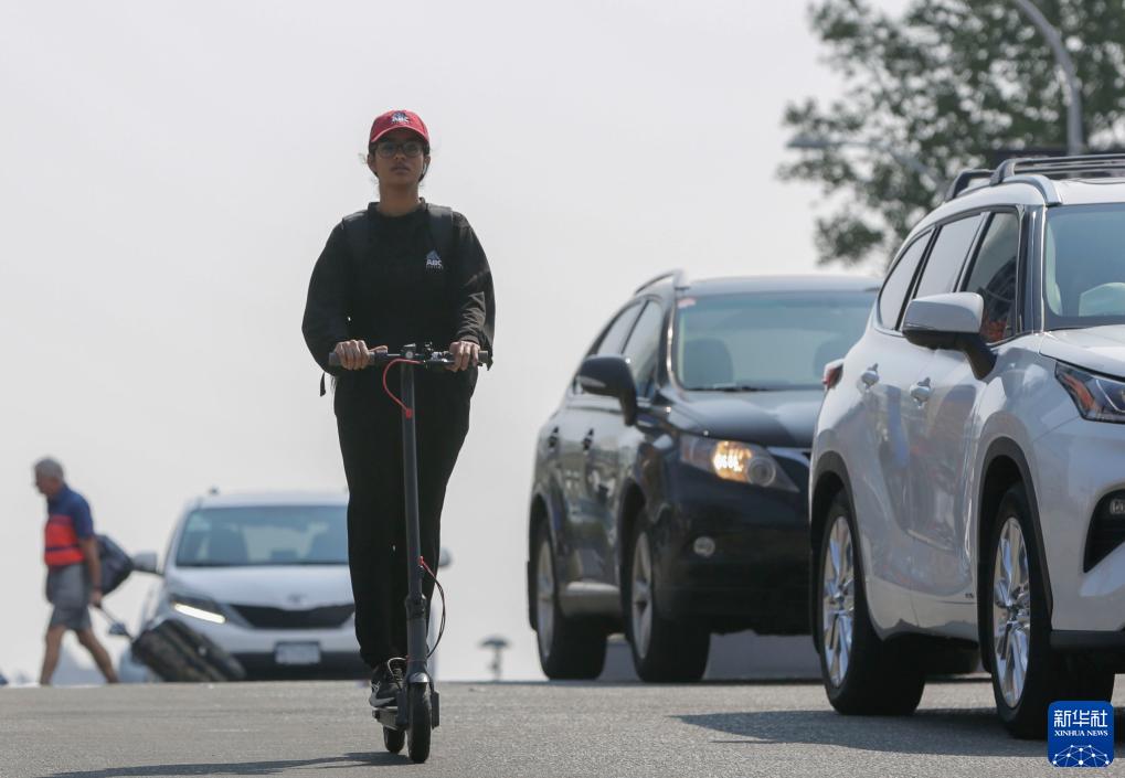 8月26日,在加拿大溫哥華,一名女子騎着電動滑板車在煙霧籠罩的街道上行駛。