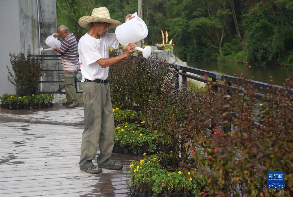 村民給景觀道邊的綠植澆水(8月24日攝)。