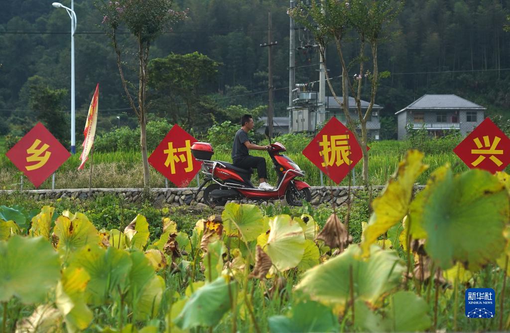 村黨支部書記吳竹林騎電動車在村裏巡視(8月24日攝)。
