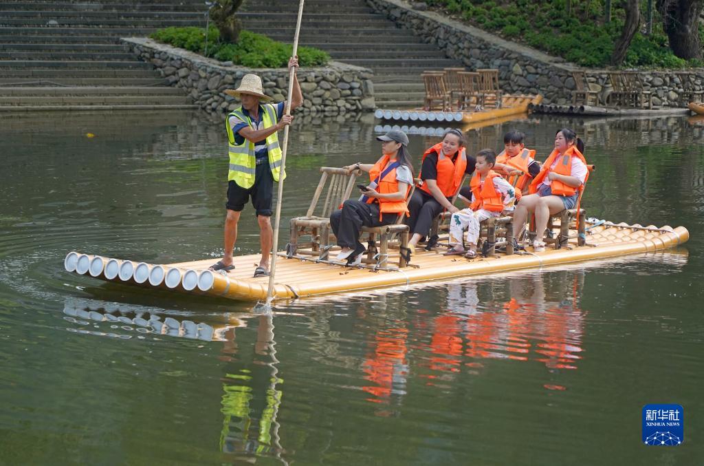 筏工包信焱(左一)帶游客體驗竹筏漂流(8月24日攝)。