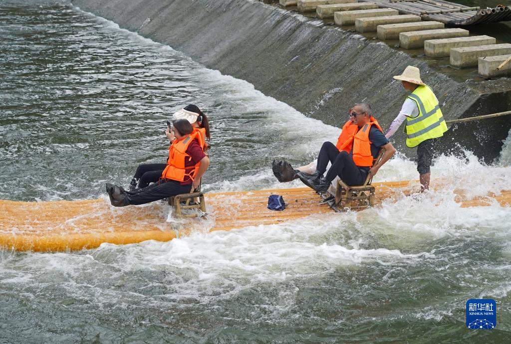 游客在港背村的小溪裏體驗竹筏漂流(8月24日攝)。