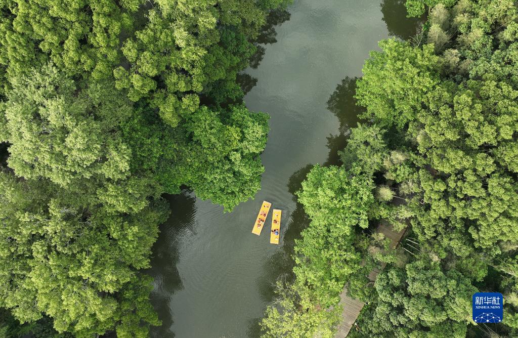 游客在港背村的小溪裏體驗竹筏漂流(8月24日攝,無人機照片)。
