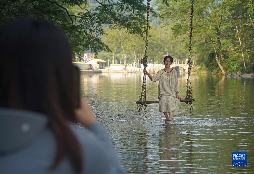 游客在港背村的網紅水上鞦韆打卡留影(8月24日攝)。