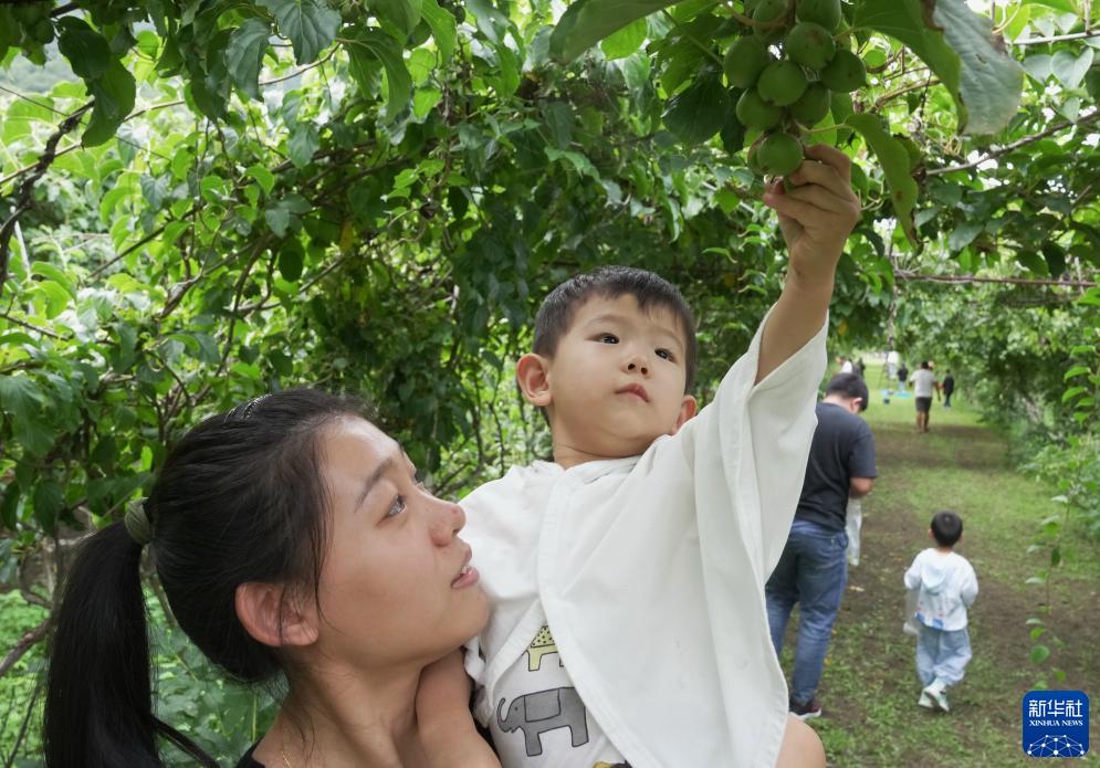8月26日,游客帶着孩子在秦皇島市海港區駐操營鎮花廠峪村軟棗獼猴桃種植基地採摘軟棗獼猴桃。