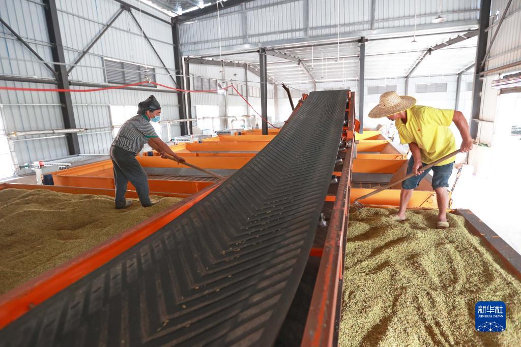 8月26日,村民在貴州省岑鞏縣羊橋土家族鄉龍灣村種子加工點烘烤水稻種子。