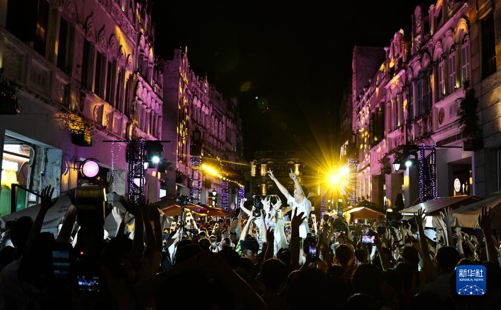 游客在海口騎樓老街觀看演出(8月22日攝)。