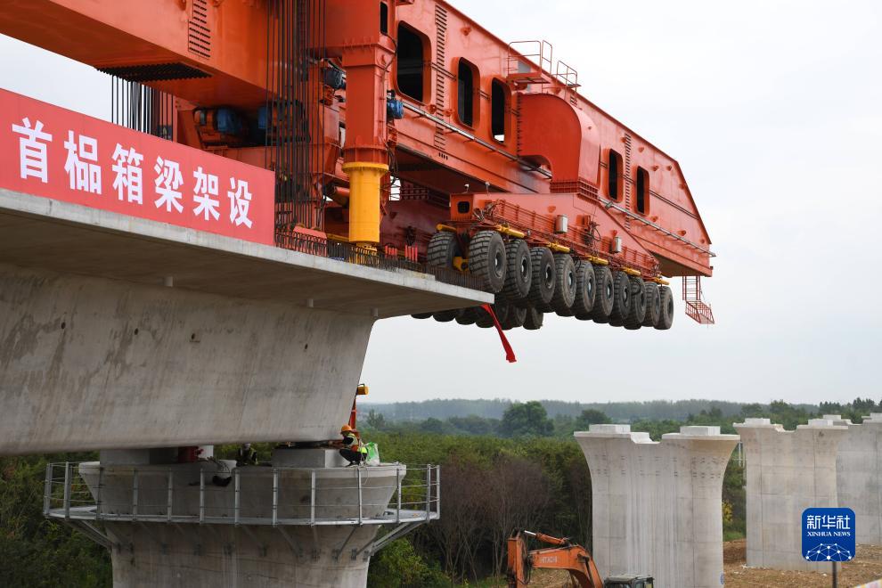 這是中國鐵建大橋局新建滬寧合高鐵全線首榀箱梁架設現場(8月27日攝)。