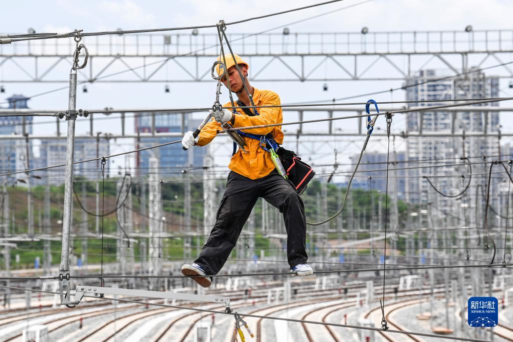 8月27日,中國鐵路南寧局集團有限公司南寧供電段的接觸網工在南寧第二動車所存車線內進行接觸網檢修作業。