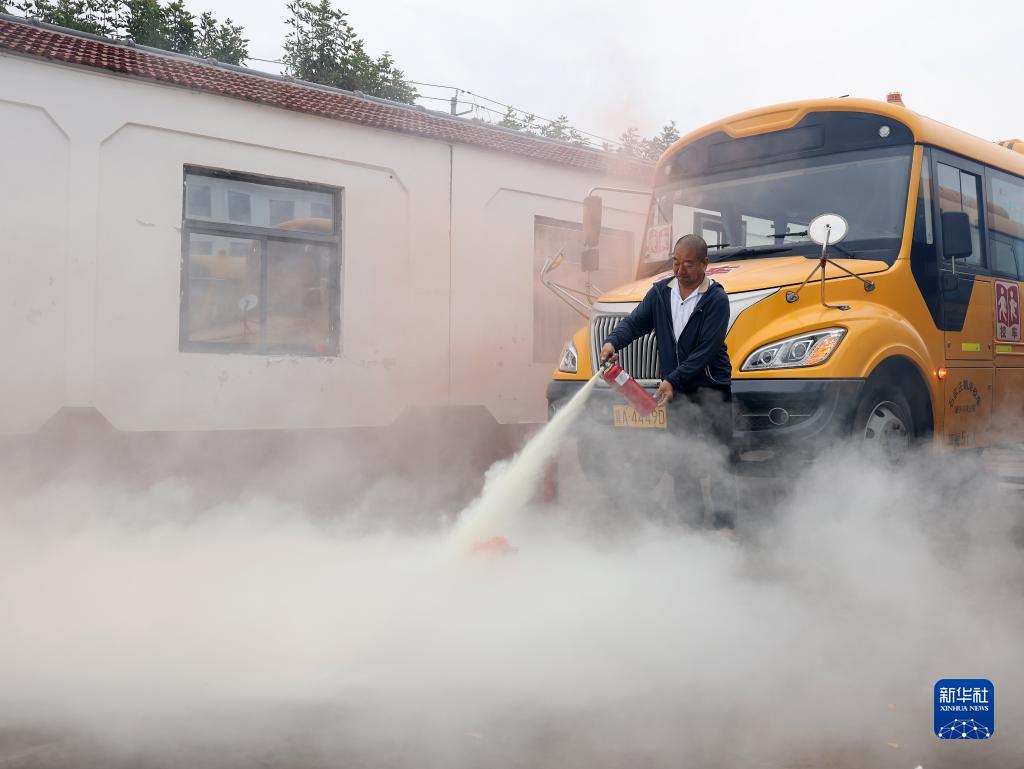 8月27日,校車司機在天鶴教育集團使用滅火器進行消防演練。