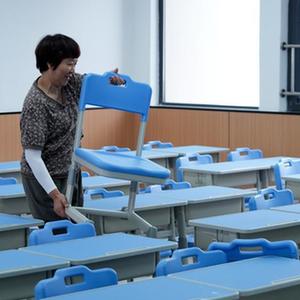 8月27日,在重慶市北碚區兩江春暉小學,工作人員在整理教室桌椅。