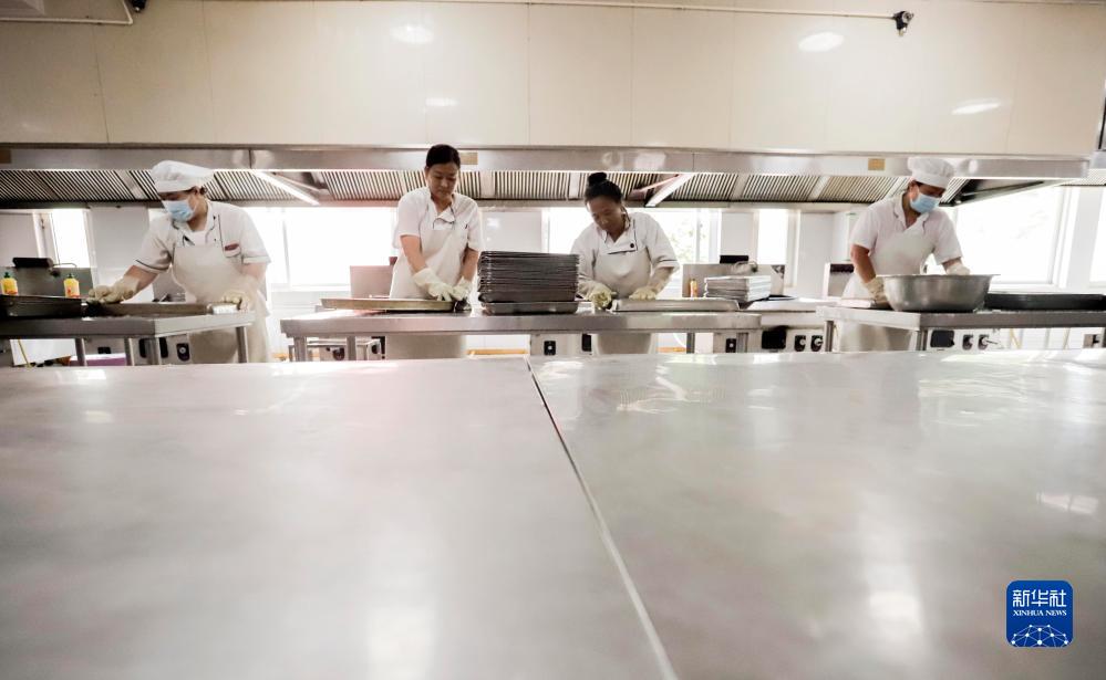8月27日,河北省遵化市第三中學的廚師在打掃廚房衞生。