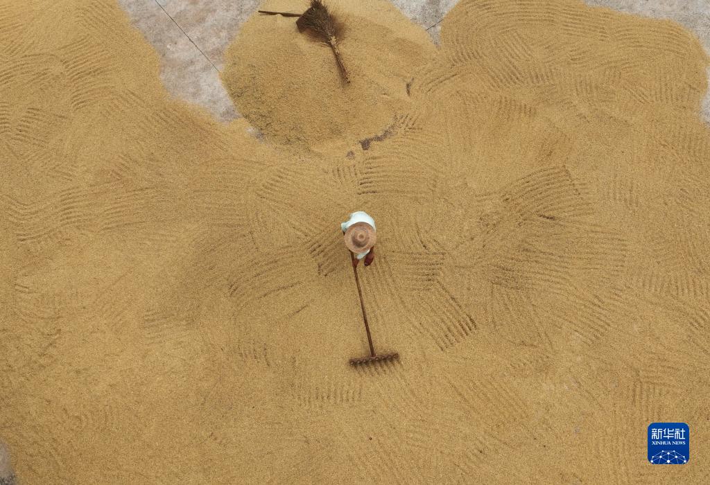 8月27日,在湖南省衡陽市石鼓區角山鎮,當地村民在晾曬稻穀(無人機照片)。
