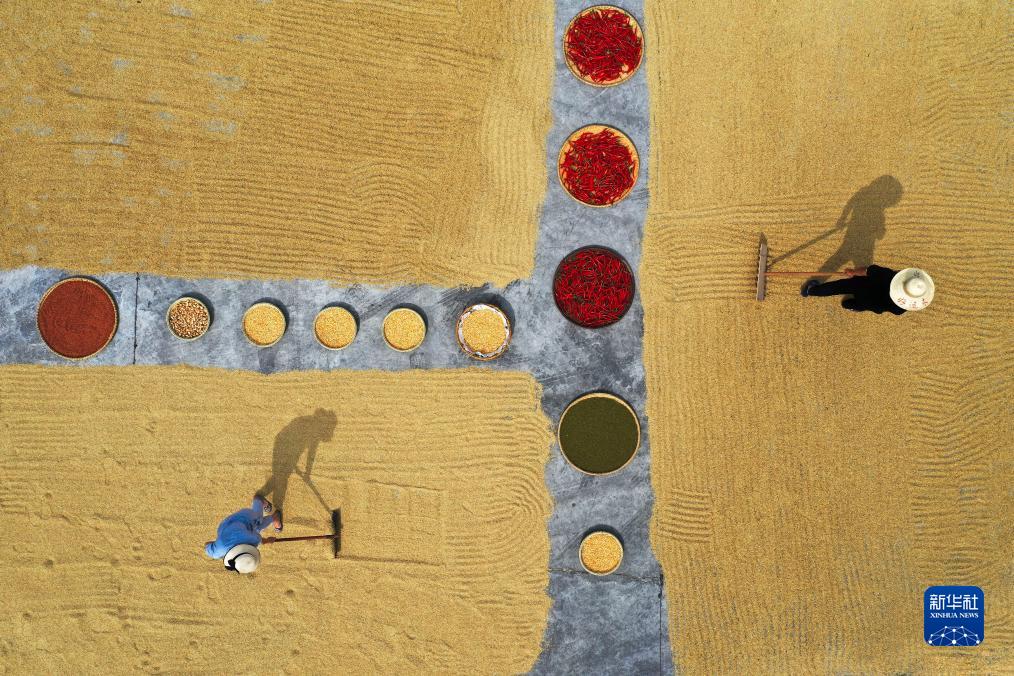 8月27日,湖南省常寧市官嶺鎮中康村農民在晾曬稻穀、辣椒等(無人機照片)。