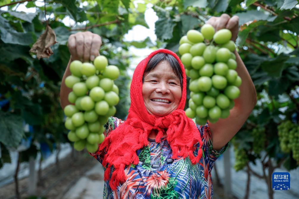 8月27日,農戶在江蘇省興化市林湖鄉鐵陸村生態葡萄園內展示採摘的葡萄。