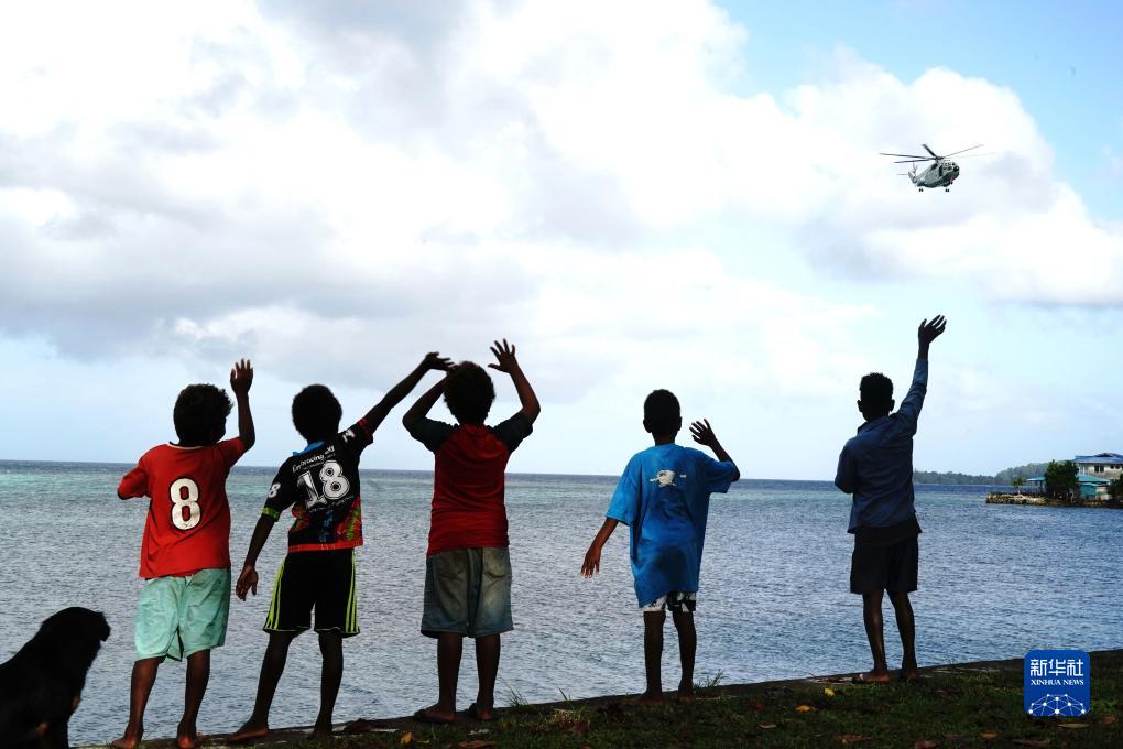 8月24日,中國海軍“和平方舟”號醫院船醫療分隊搭乘艦載醫療救護直升機前往所羅門群島圖拉吉島巡診,島上的孩子們揮手致意。