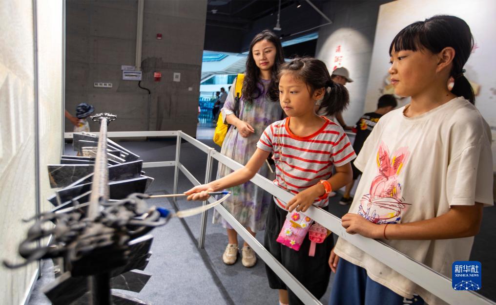8月27日,小朋友在江蘇泰州科技館中國古代科技展區體驗中國古代敲打樂器“編磬”。