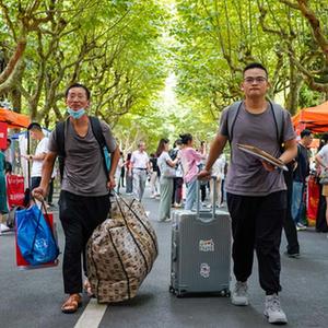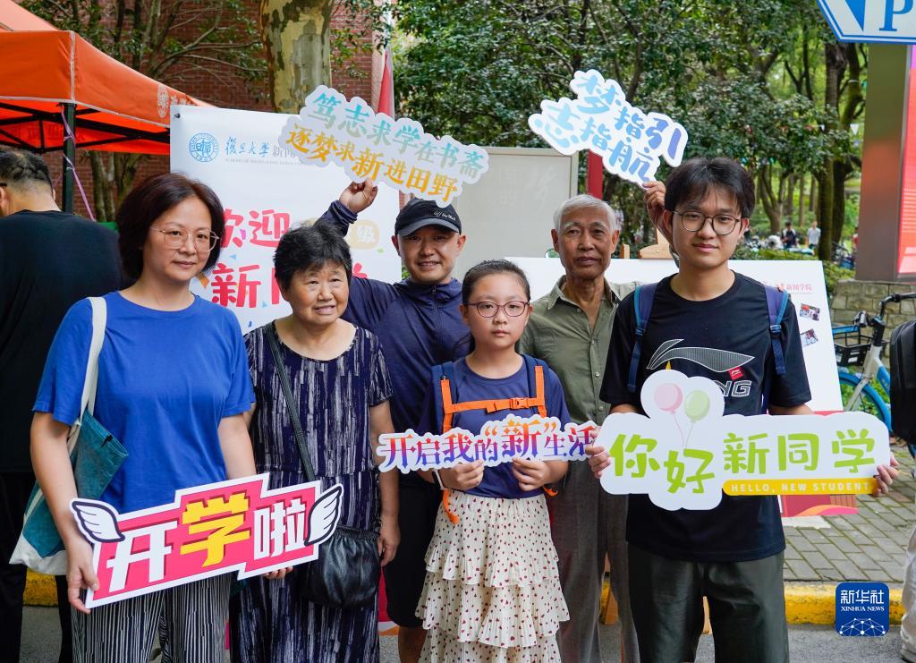 8月27日,復旦大學新生(右一)在新聞學院的迎新攤位前與家人合影。
