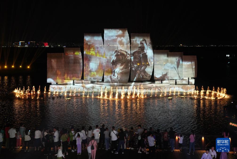 8月27日,游客在北戴河鴿子窩公園欣賞水舞幻影秀《浪淘沙·千古風流》。