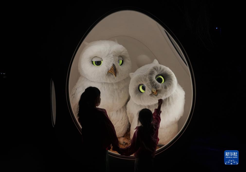 8月27日,小朋友在北戴河鴿子窩公園與大型倣真貓頭鷹玩偶互動。