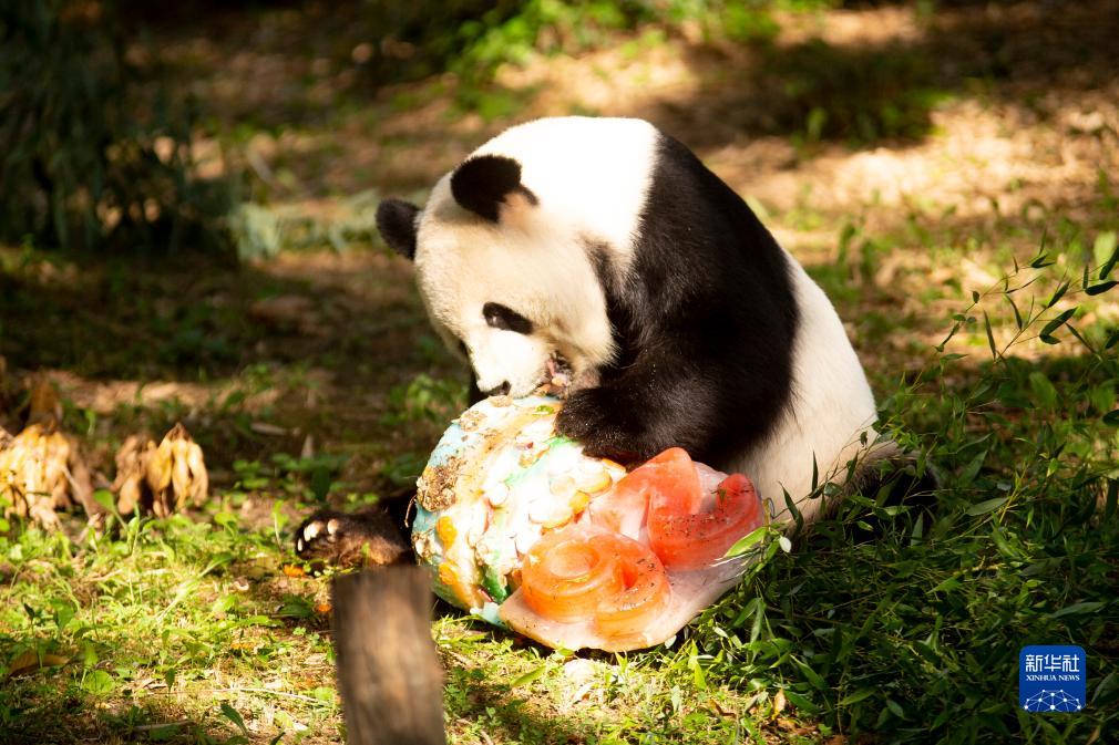 8月27日,大熊貓“添添”在美國首都華盛頓史密森學會國家動物園享用生日蛋糕。