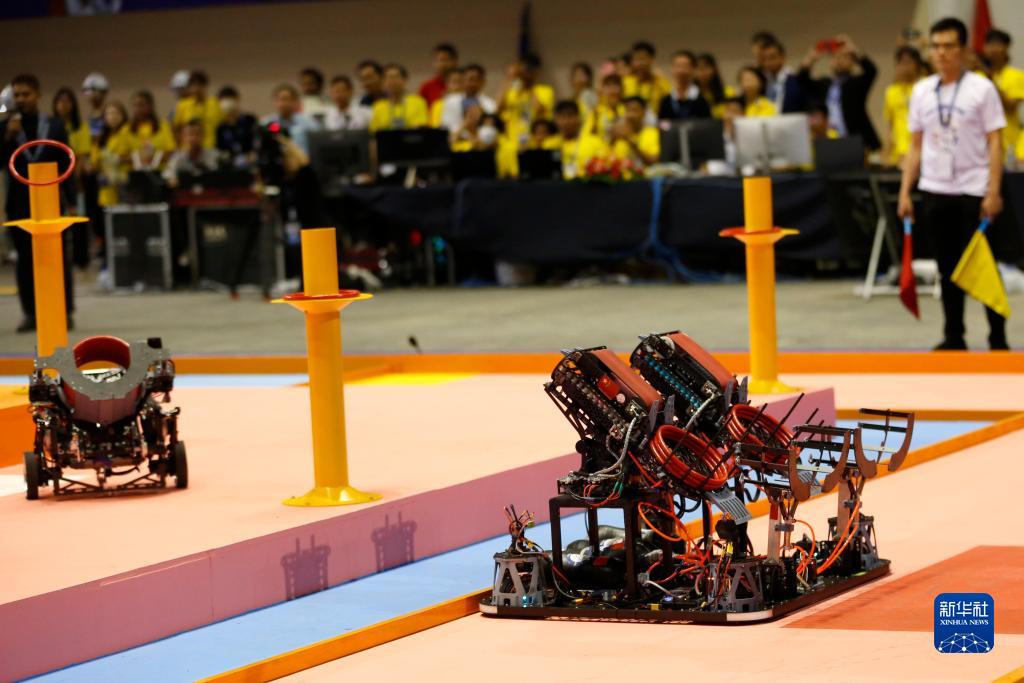 8月27日,在柬埔寨首都金邊,中國隊機器人參加2023亞太大學生機器人大賽。