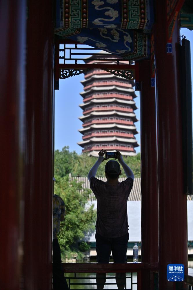 8月28日,參觀者在中國園林博物館鏡影亭參觀。