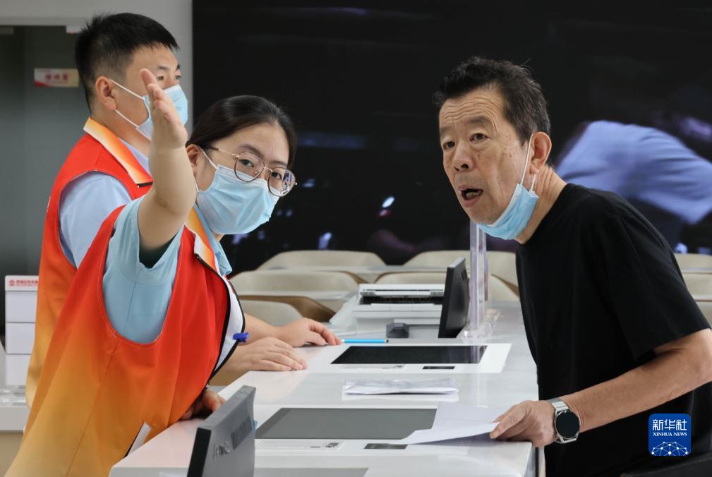 8月25日,在北京市公安局西城分局&&境接待大廳,工作人員在引導一位男士去相應的辦理區域。