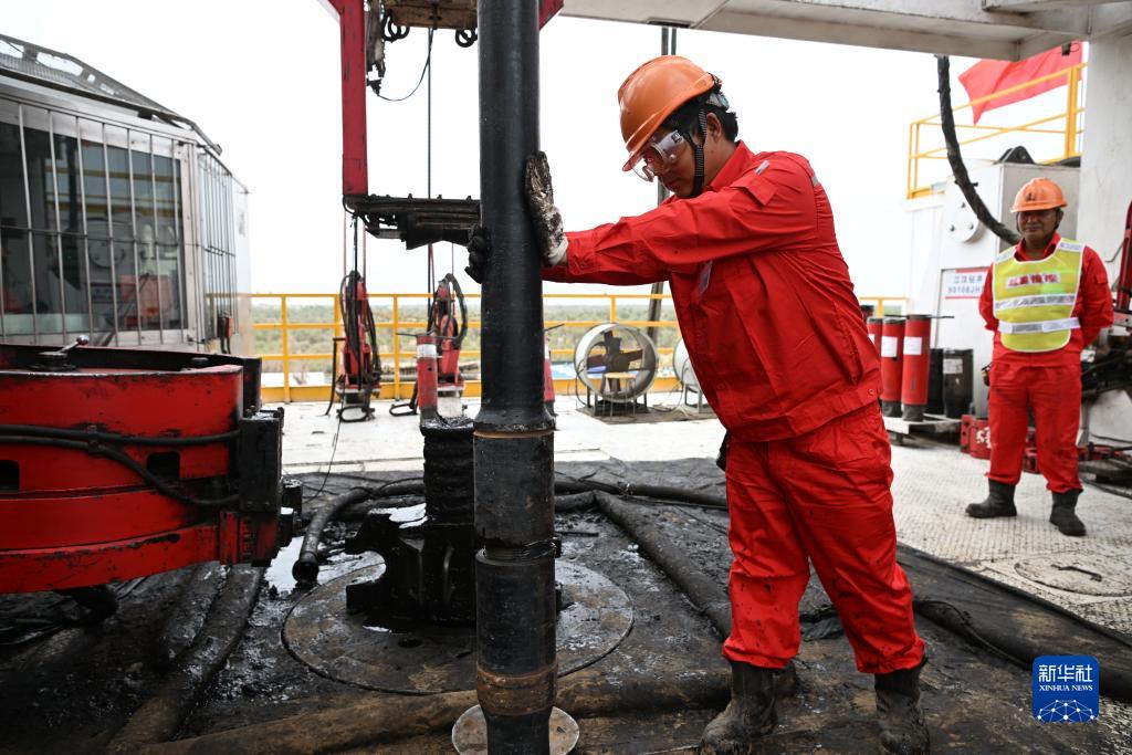 工作人員在中國石化塔裏木盆地“深地工程”躍進3-3XC油氣井進行鑽井輔助作業(8月21日攝)。