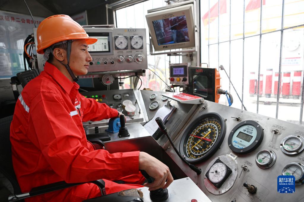 工作人員在中國石化塔裏木盆地“深地工程”躍進3-3XC油氣井操作我國自主研發的超深井自動化鑽機進行鑽井作業(8月21日攝)。