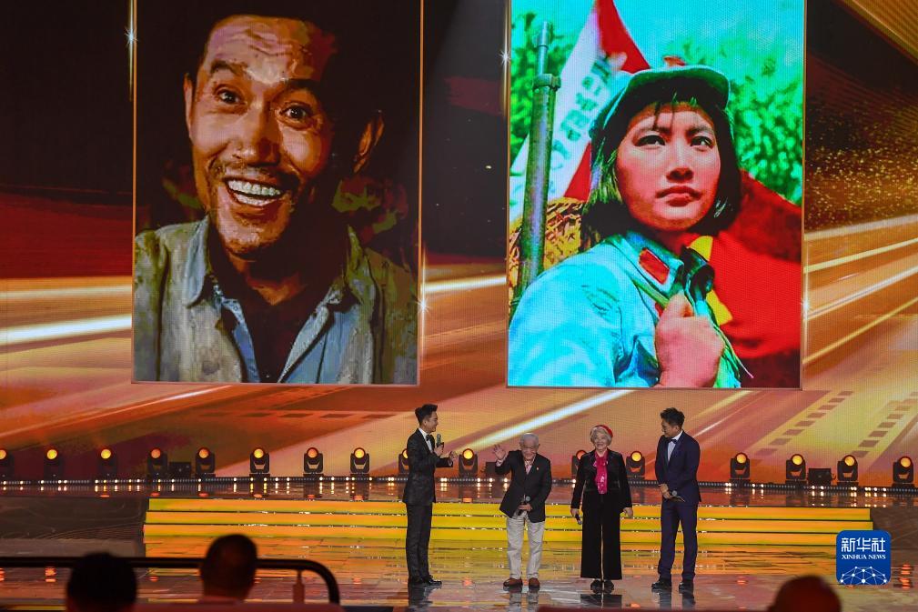 8月28日,演員牛犇(左二)、祝希娟(右二)在第十八屆中國長春電影節開幕式現場致辭。