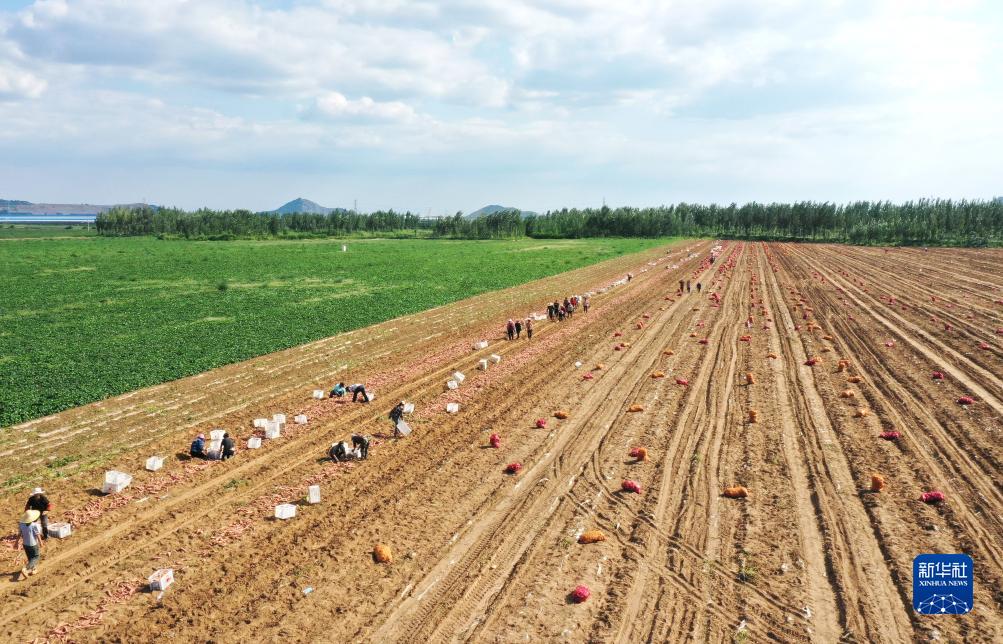 8月28日,灤州市九百戶鎮一家鮮食紅薯種植合作社的社員在田間收穫煙薯(無人機照片)。
