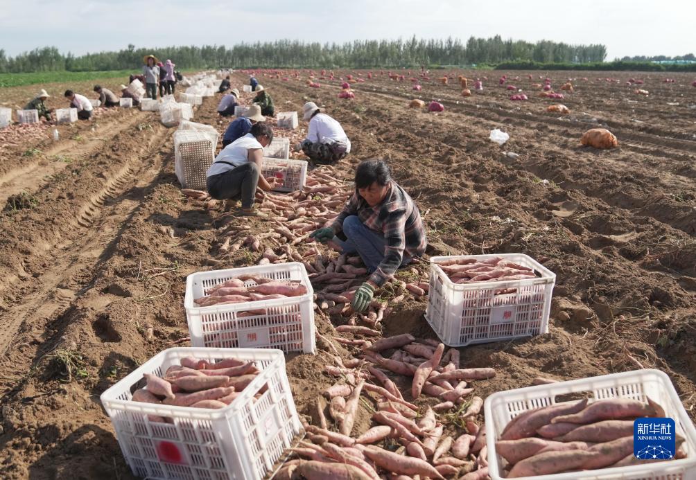 8月28日,灤州市九百戶鎮一家鮮食紅薯種植合作社的社員在田間收穫煙薯。