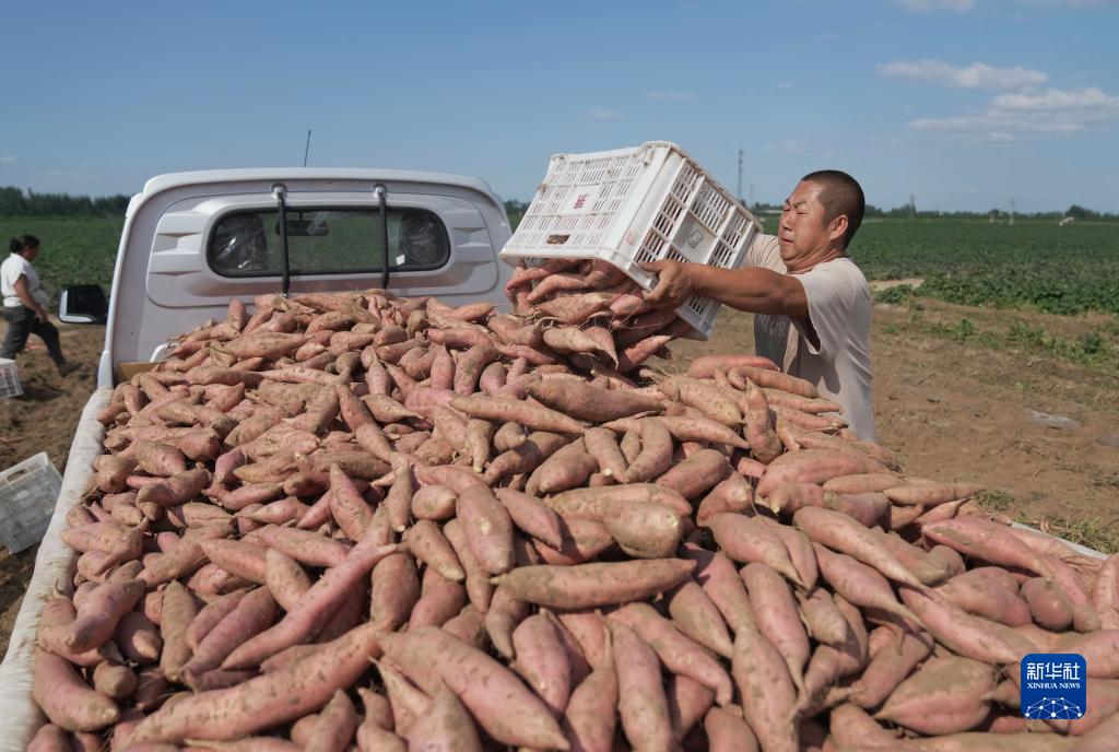 8月28日,灤州市九百戶鎮一家鮮食紅薯種植合作社的社員在將收穫的煙薯裝車。