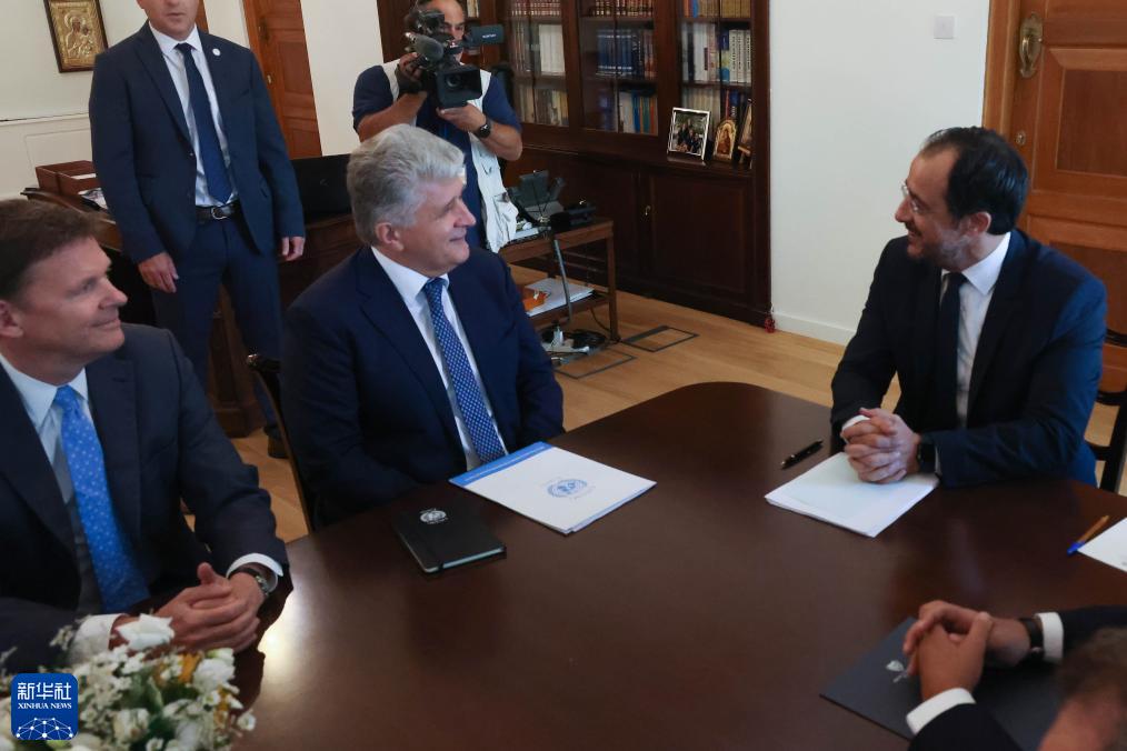 8月28日,在塞浦路斯尼科西亞,聯合國負責歐洲、中亞和美洲事務的助理秘書長米洛斯拉伕·延恰(前中)與塞浦路斯希臘族領導人、總統赫裏斯托祖利季斯(前右)舉行會談。