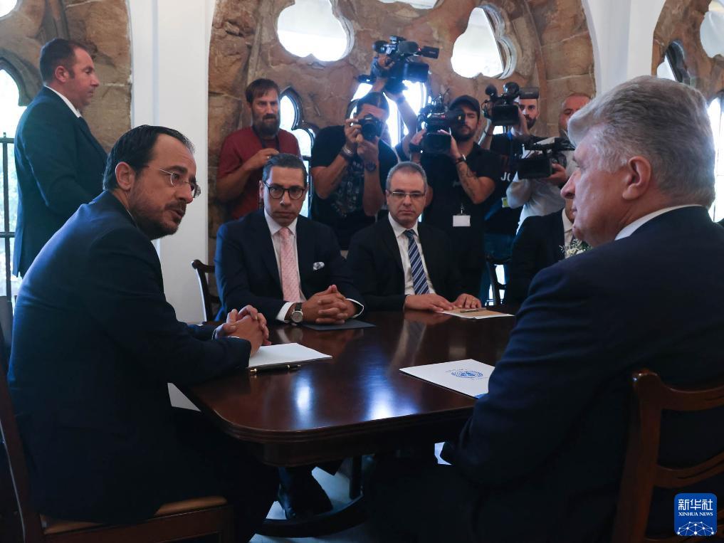 8月28日,在塞浦路斯尼科西亞,聯合國負責歐洲、中亞和美洲事務的助理秘書長米洛斯拉伕·延恰(前右)與塞浦路斯希臘族領導人、總統赫裏斯托祖利季斯(前左)舉行會談。