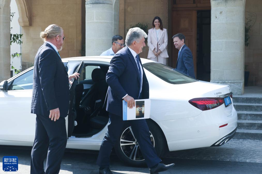 8月28日,聯合國負責歐洲、中亞和美洲事務的助理秘書長米洛斯拉伕·延恰(前右)抵達塞浦路斯尼科西亞總統府。