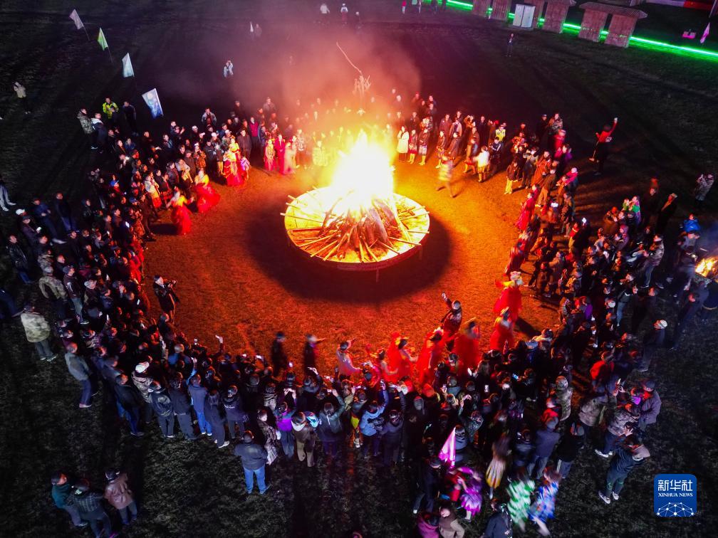 新疆和田策勒縣板蘭格景區,游客在環塔拉力賽崑崙天路賽段篝火晚會上載歌載舞(5月30日攝,無人機照片)。