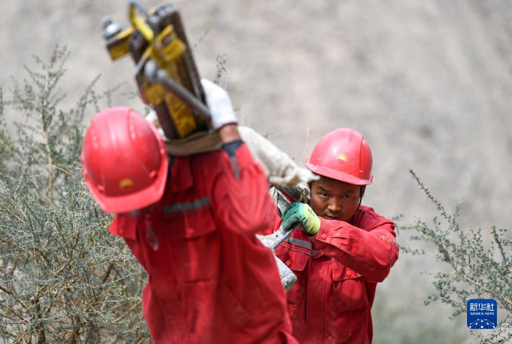 新疆西天山深處,東方物探公司塔裏木物探處2170隊的鑽工譚金龍(後)和工友一起扛着鑽井設備上山(6月18日攝)。