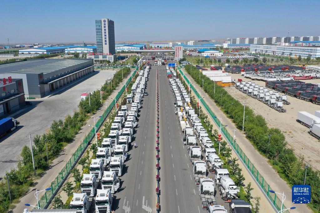 國産商品車排隊進入新疆霍爾果斯綜合保稅區(7月26日攝,無人機照片)。